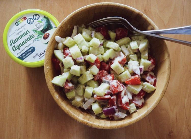 Pelar y trocear los pepinos, los tomates cherry y la cebolla. En un bol, mezclar el yogur, con un poco de limón, el hummus de aguacate, un poco de aceite de oliva virgen extra, sal y pimienta. Añadir la salsa a las verduras y listo.